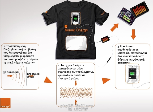 Πρωτοποριακά μπλουζάκια που θα μπορούν να φορτίσουν τα κινητά σας μέσω των ηχητικών κυμάτων, παρουσίασε ο πάροχος κινητής τηλεφωνίας Orange.