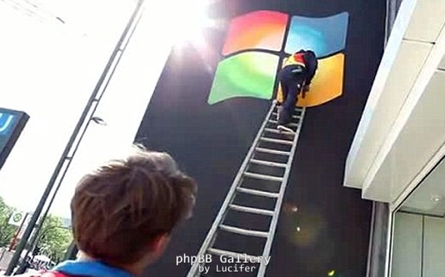 «Αντάρτες» έβαψαν με τα χρώματα αλλά και το λογότυπο των Microsoft Windows το υπό κατασκευή κατάστημα της Apple στο κέντρο του Αμβούργου.