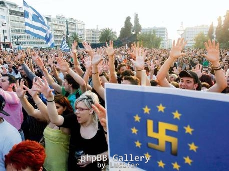 Οι Έλληνες χλευάζουν την Ευρώπη αλλά την ίδια στιγμή λαμβάνουν νέα βοήθεια δεκάδων δις ευρώ, γράφει η Bild η οποία στο άρθρο της έχει φωτογραφία του AP όπου η ευρωπαϊκή σημαία απεικονίζεται παραλλαγμένη έχοντας στο κέντρο της τη γερμανική σβάστικα. Η σημαία χρησιμοποιήθηκε σε συγκέντρωση των αγανακτισμένων προκειμένου, προφανώς, να εκφράσει την αντίδραση στην αλαζονεία, την υπεροψία και τα προσβλητικά σχόλια Γερμανών αξιωματούχων απέναντι στην Ελλάδα και τους Έλληνες αλλά και τον τρόπο με τον οποίο πιέζουν για όλο και μεγαλύτερη εκχώρηση εθνικής κυριαρχίας ώστε να εξασφαλιστεί η αποπληρωμή των ελληνικών δανείων.