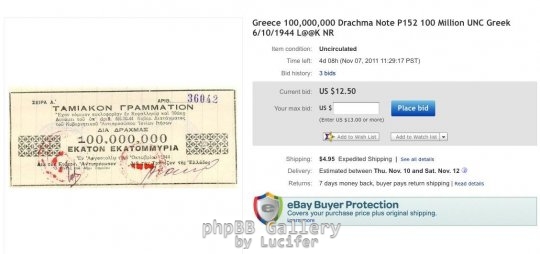 Σημείο των καιρών: Αυτή τη στιγμή στο ebay πωλείται χαρτονόμισμα 100 εκ δραχμών του 1944 έναντι 12,50 δολαρίων.