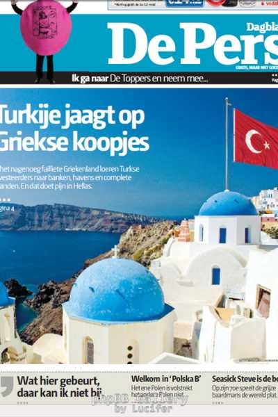 Με ένα προκλητικό εξώφυλλο, το οποίο απεικονίζει εκκλησία της Σαντορίνης να φέρει στην κορυφή του τρούλου μία τουρκική σημαία, η εφημερίδα De Pers, αναφέρει ότι «εν όψει πτώχευσης Τούρκοι επενδυτές βρίσκουν ελκυστικές επενδύσεις στην Ελλάδα».