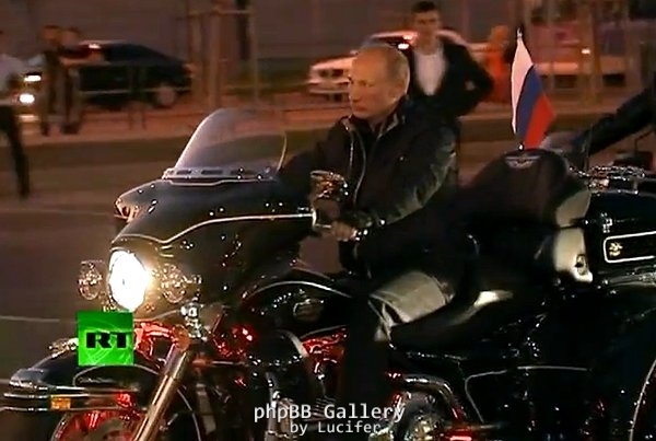 Ο 58χρονος Πούτιν εμφανίστηκε -ντυμένος σαν μαύρος καβαλάρης- επικεφαλής πομπής μοτοσικλετιστών.