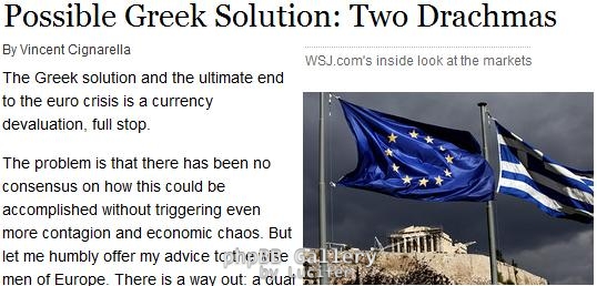 δραχμή απ' όσα τους χρωστούμε. Σε άρθρο του Vincent Cignarella στη Wall Street Journal στην κατηγορία για τις διεθνείς αγορές, το θέμα επανέρχεται ως λύση για την Ελλάδα με την πρόταση να δημιουργεί μία κανονική και μία χρηματιστηριακή δραχμή.