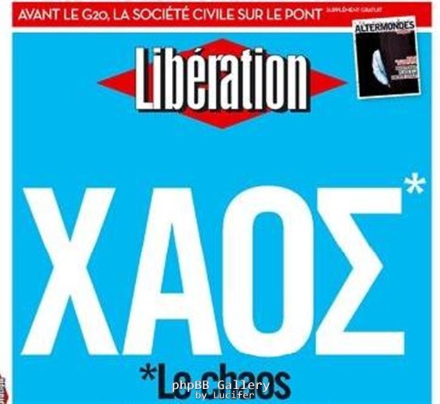 Η γαλλική εφημερίδα «Liberation», η οποία κυκλοφορεί σήμερα Τετάρτη με τον ελληνικό τίτλο «Χάος», αναφέρεται στο πρωτοσέλιδο άρθρο της στην απόφαση του πρωθυπουργού κ. Γιώργου Παπανδρέου για δημοψήφισμα για τη δανειακή σύμβαση.
